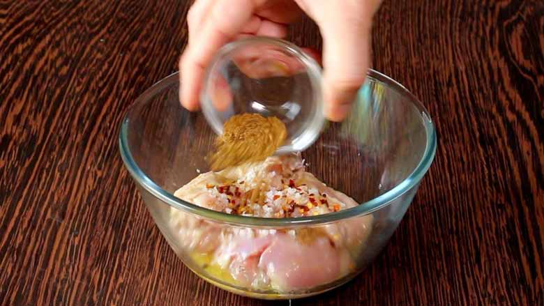 . Prepare a marinade for the chicken. Season a large frying. Preheat oven to 350 degrees.